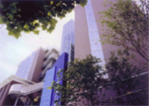 - ・東通り周辺は比較的事務系の建物が多く、その奥は住宅地となっている。そこで外観は茶系のタイルで落着いた雰囲気にし、アクセントとなる笠木は、アルミのシルバー色でシャープにデザインし北面に大きくとったカーテンウォールにも反射フィルムを貼り、全体的に落着いた雰囲気の中に新しさを加え、あきのこない建物とした